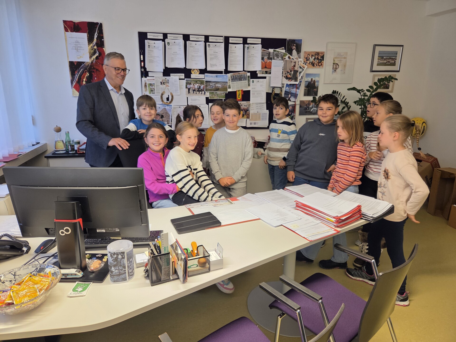 Am 9. Oktober 2025 besuchten wir die Gemeinde in Friedburg. Bürgermeister Erich Rippl nahm sich kurz vor seinem Pensionsantritt und auf Wunsch von Luis für uns noch Zeit und führte uns durch die Gemeinde, stellte uns die Mitarbeiterinnen und Mitarbeiter vor und erzählte den Kindern von den vielfältigen Aufgaben einer Gemeinde. Im Anschluss wurden wir mit Kuchen (Danke an Luis' Mama für den leckeren Kuchen) und Getränken verköstigt und die Kinder durften ihm viele Fragen stellen. Es war ein sehr lustiger und informativer Vormittag.
